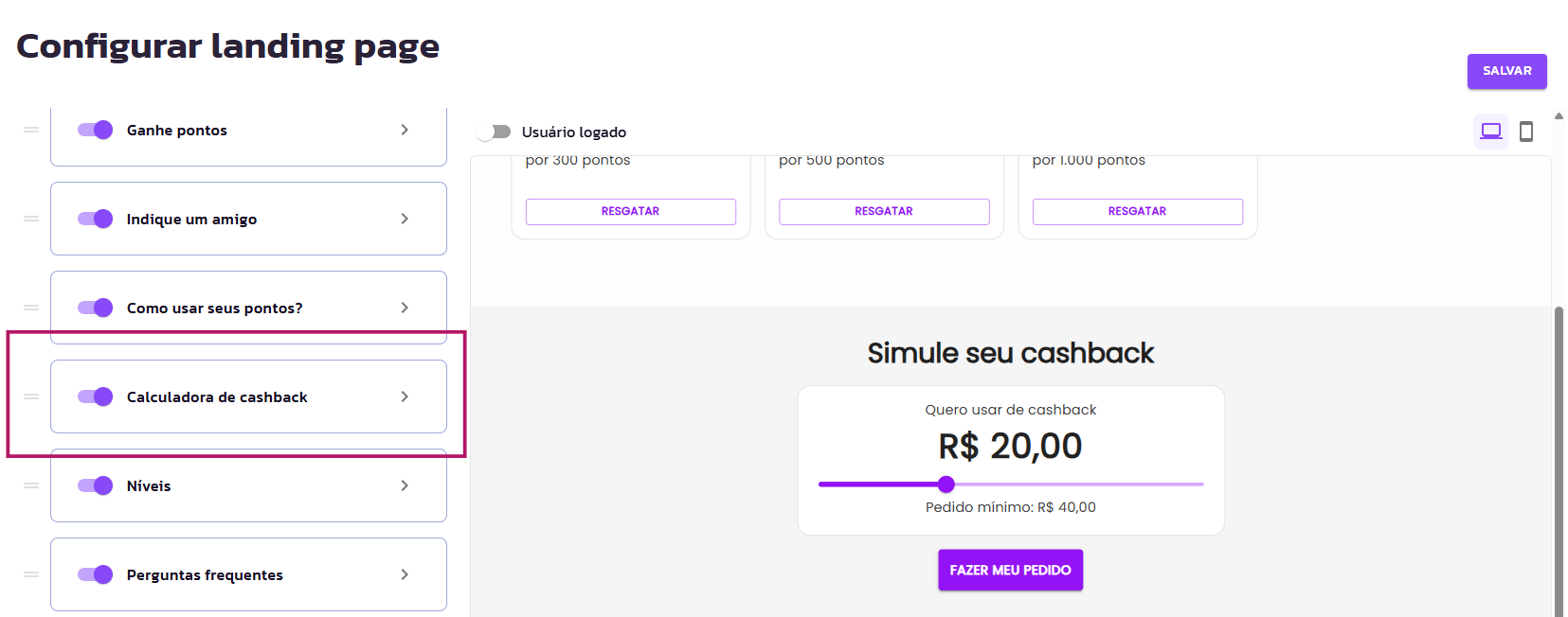 - Para a Calculadora: A seção aparecerá no menu lateral, para habilitar é necessário a recompensa de Cashback e a representatividade do cashback estarem configurados. Ative a chave "Exibir Seção" e escolha entre os 4 layouts disponíveis.