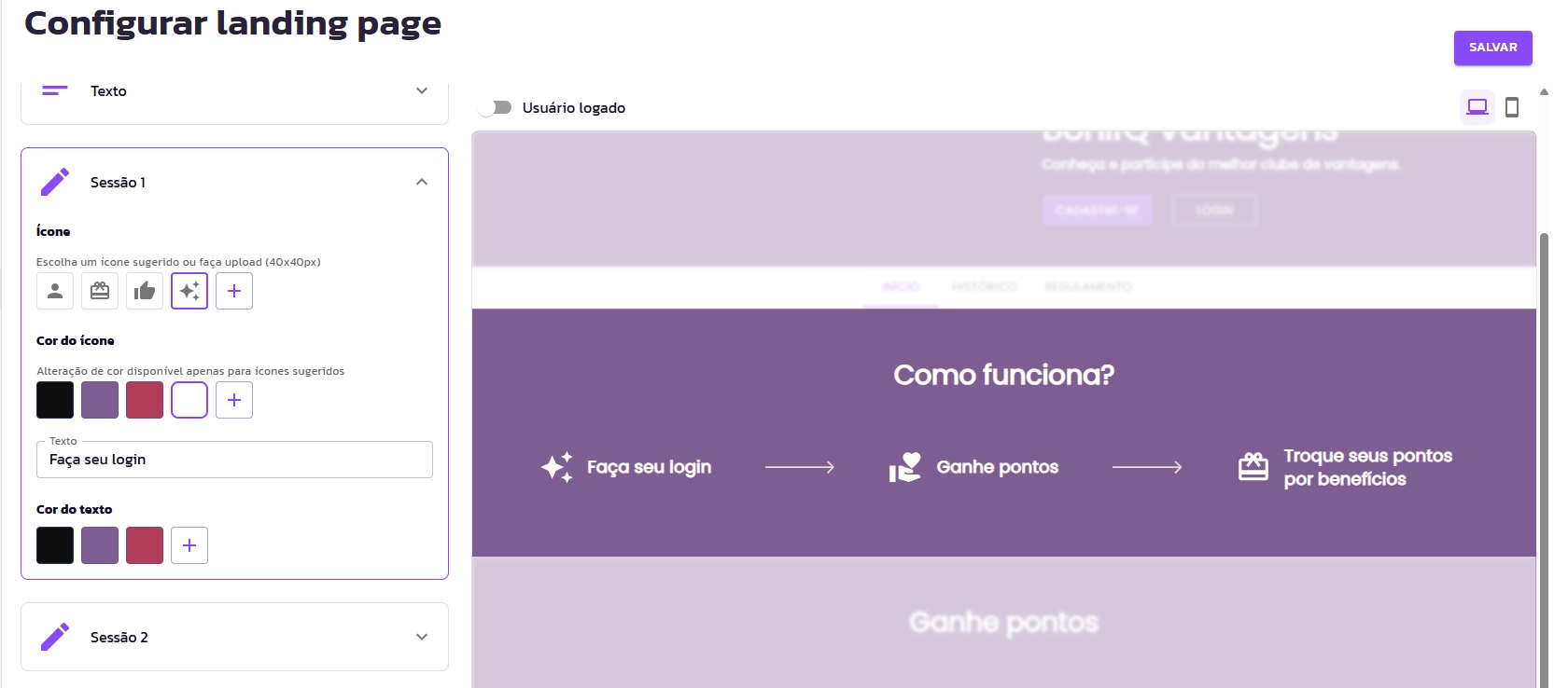 - Para o Como Funciona: Clique em cada etapa individualmente para trocar o ícone, alterar a cor da marca e editar o título.